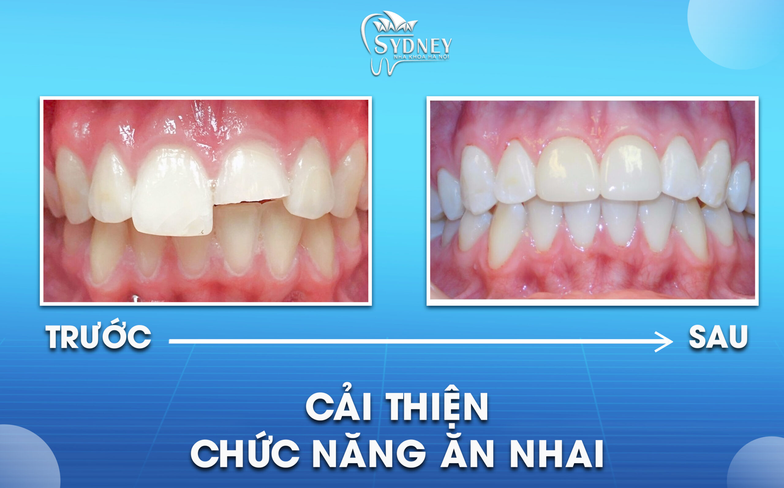 Nếu như răng bạn bị sứt mẻ dẫn tới việc ăn nhai của bạn bị ảnh hưởng rất nhiều. Cho nên khi sử dụng phương pháp bọc răng sứ sẽ giúp bạn cải thiện được chức năng nhai tốt hơn. Hơn nữa, răng sứ được bọc có thể chịu được tác dụng lực rất cao. Cho nên bạn sẽ rất yên tâm khi ăn uống.